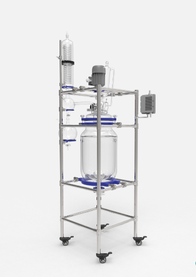 双层玻璃反应釜为双层玻璃设计,内层放入反应溶媒可做搅拌反应,夹层可通上不同的冷热源(冷冻液,热水或热油)做循环加热或冷却反应。在设定恒温条件下,在密闭的玻璃反应器内,可根据使用要求在常压或负压条件下进行搅拌反应,并能做反应溶液的回流与蒸馏,是现代精细化工厂、生物制药和新材料合成的理想中试、生产设备。